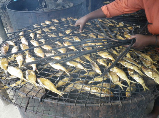 ベナンの漁師町でみた燻製作業の様子。 コールドチェーンが発達していないベナンでは、燻製にした魚が保存食として重宝されています。燻製作業は主に女性の仕事とされ、枝や葉などを燃やして出た煙で燻します。香ばしく仕上がった燻製は、そのままメインディッシュとして食べても美味しいですが、他の具材と一緒にスープで煮込んでも美味しいです。 |